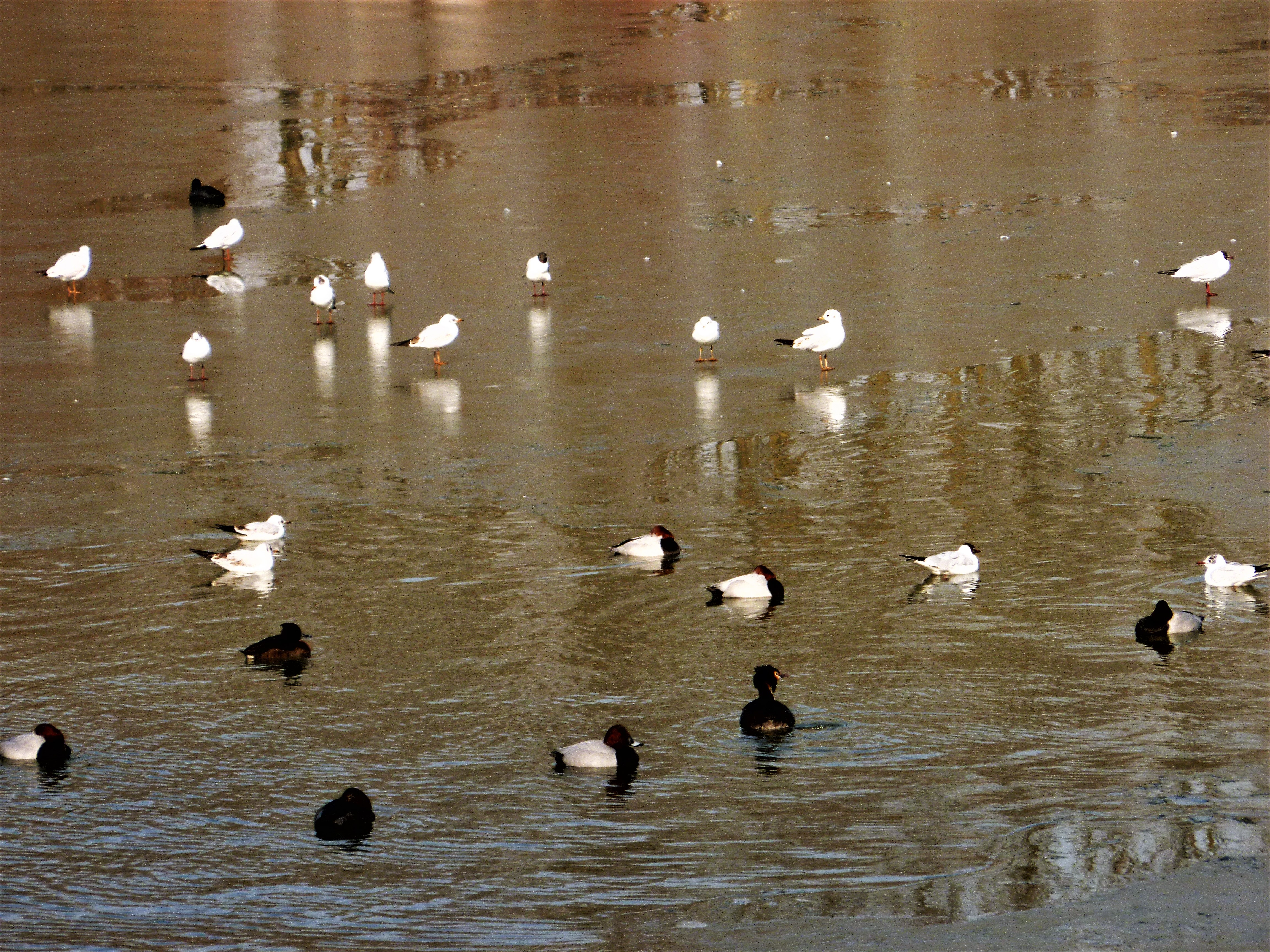 P1020669 6 mars 2018 par mesbaladesphotossansfaon Poster un commentaire Canards et mouettes font bon ménage. Etangs de Neerpede en hiver.